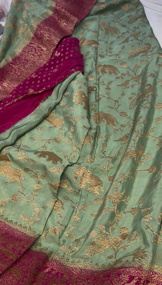 Mint green with pink pure crepe Banarasi saree (pure100)