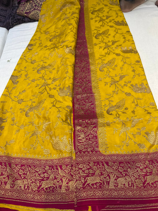 Yellow with pink pure crepe Banarasi saree