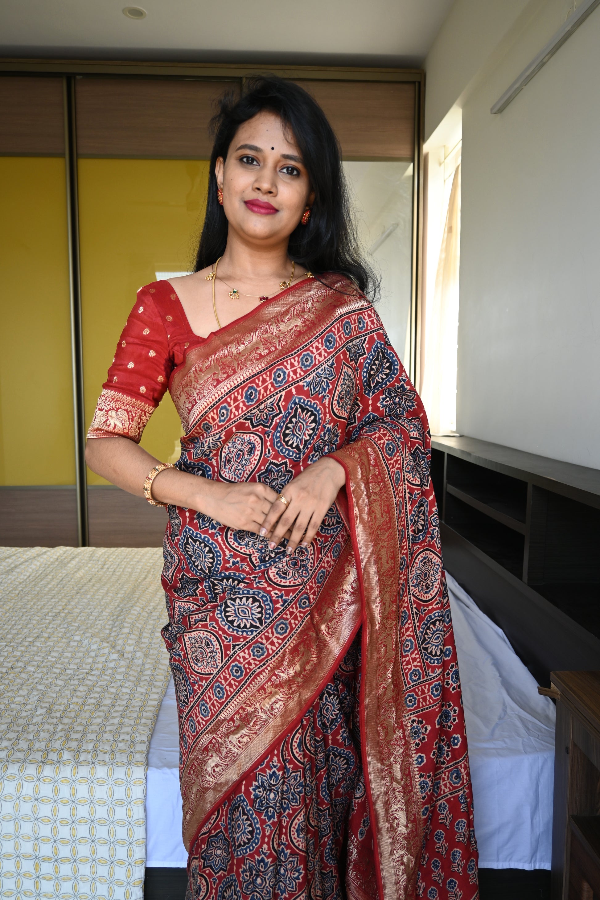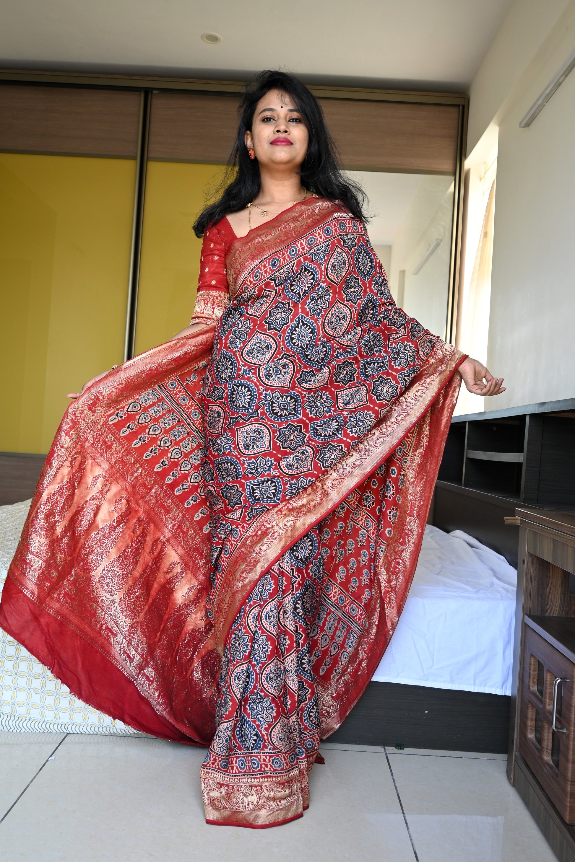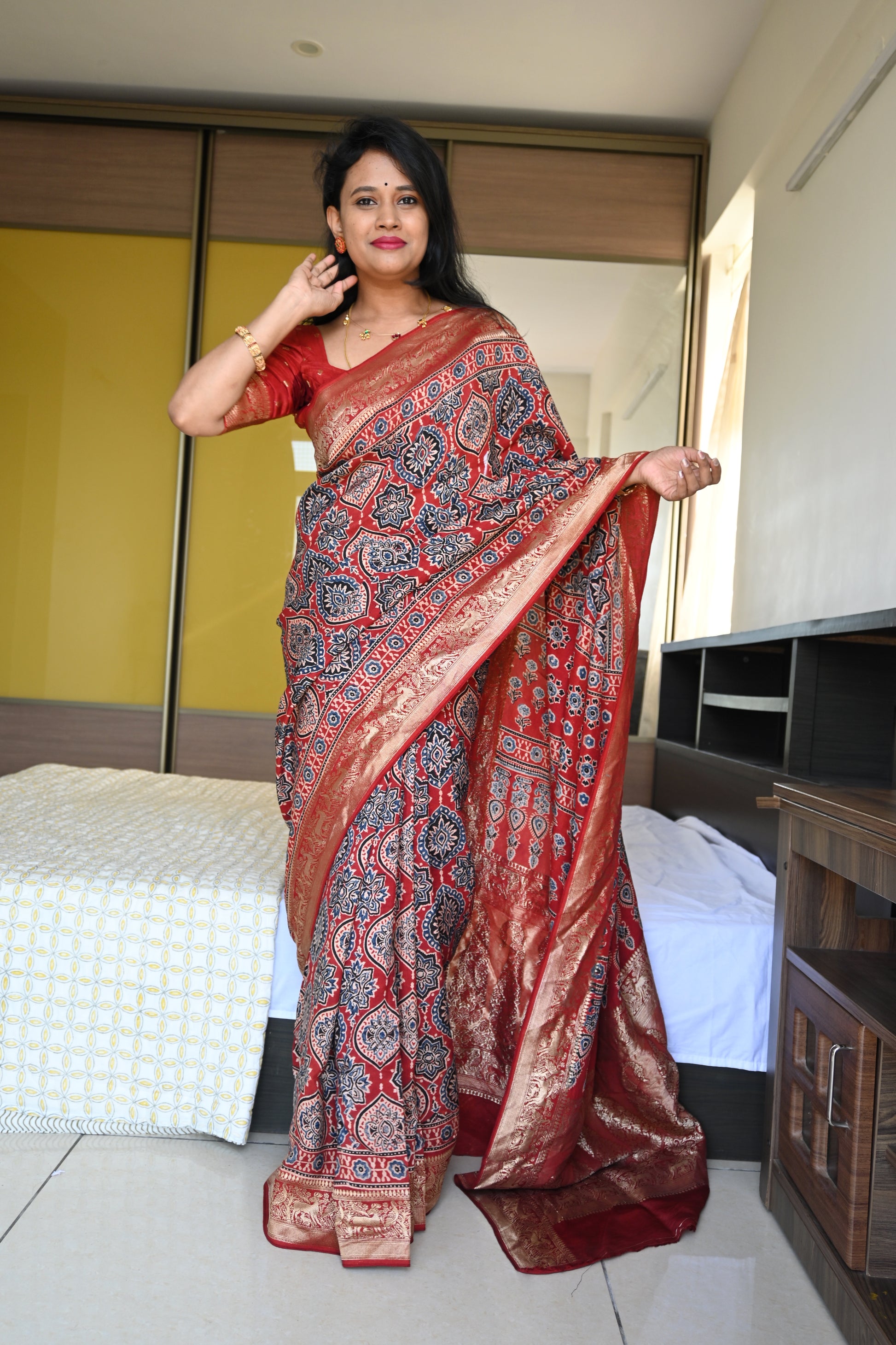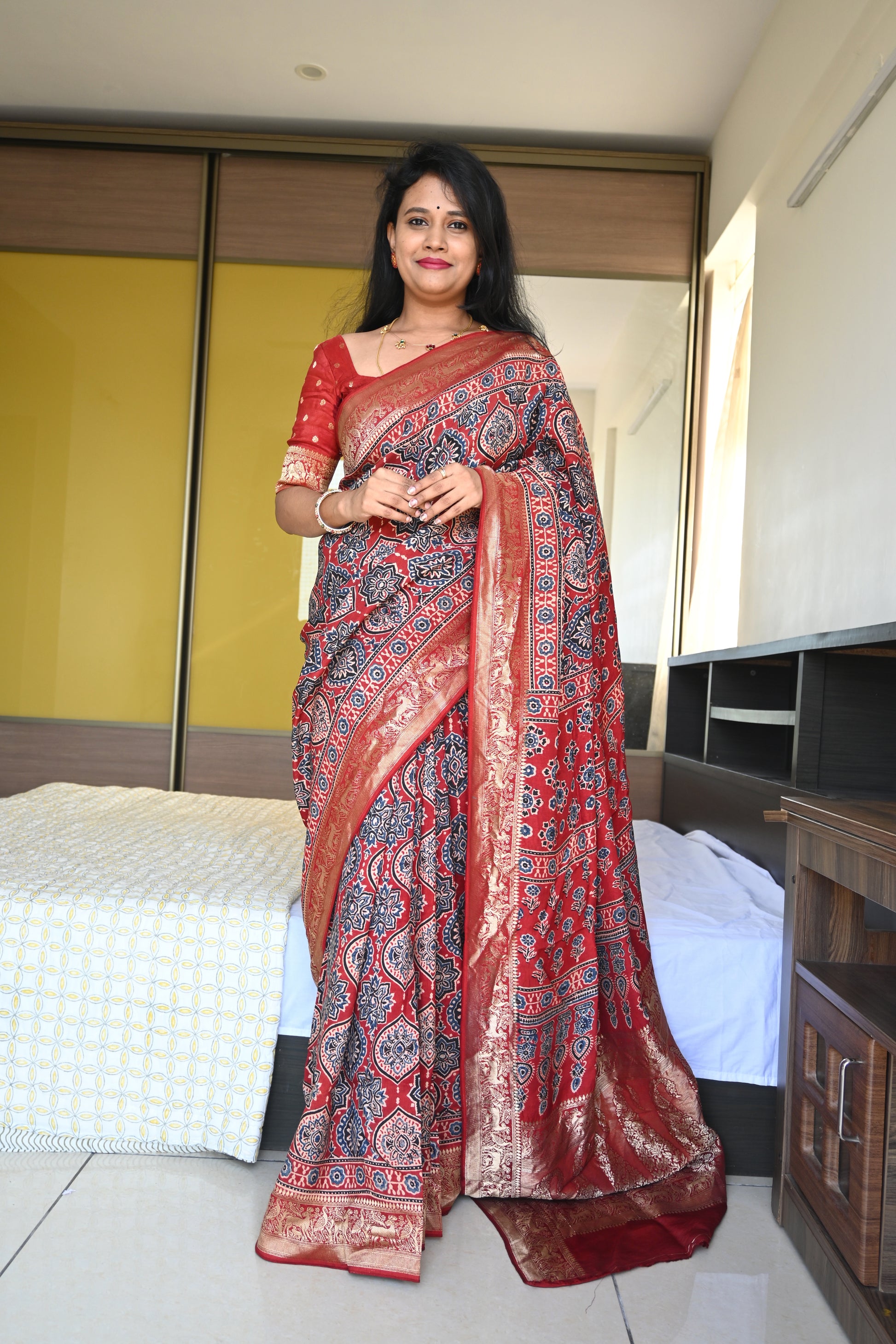 Premium Ajrakh Dola Silk Saree – Naturally Dyed & Handcrafted Elegance