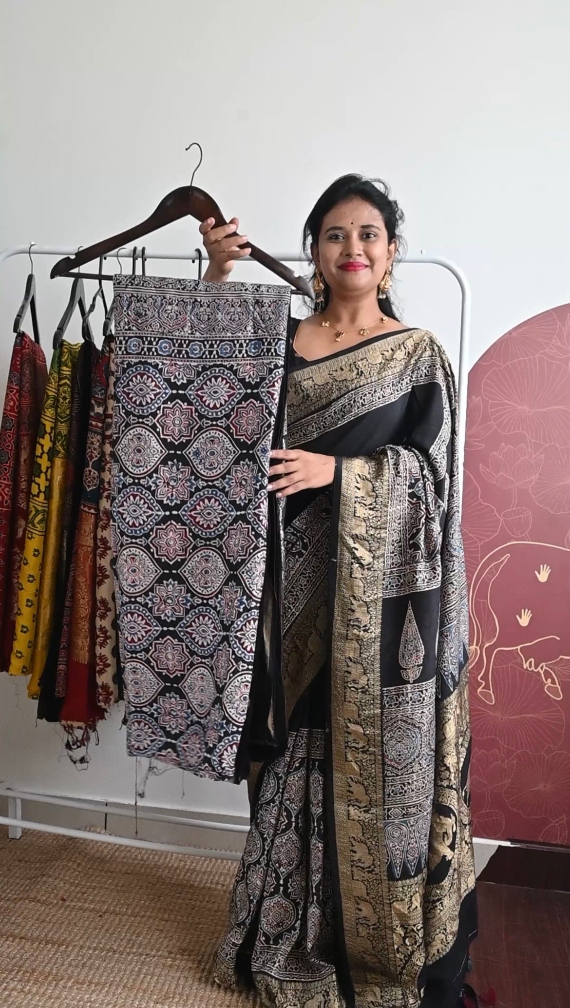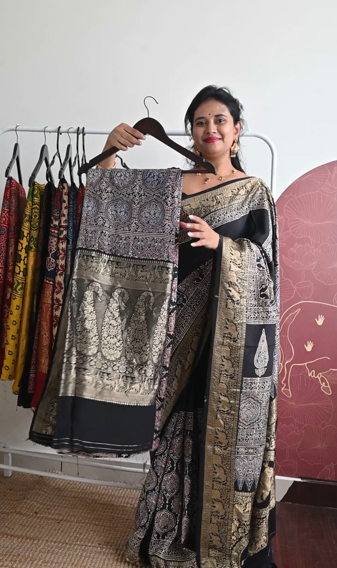 Elevate your ethnic wardrobe with this exquisite Dola silk saree, adorned with traditional Ajrakh hand block prints crafted by skilled artisans. Made using age-old techniques and dyed naturally without chemicals, this saree is a beautiful blend of heritage, sustainability, and elegance.
