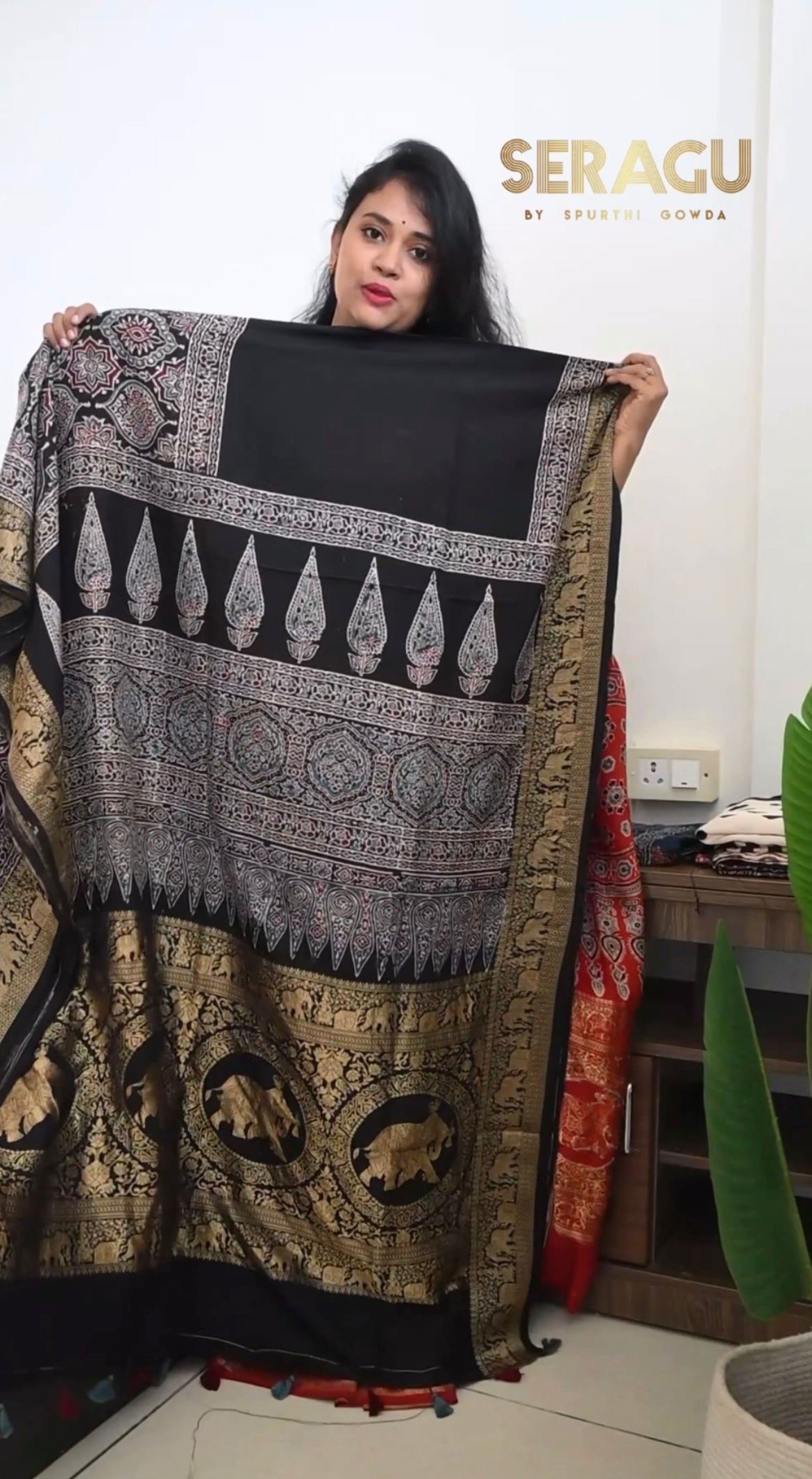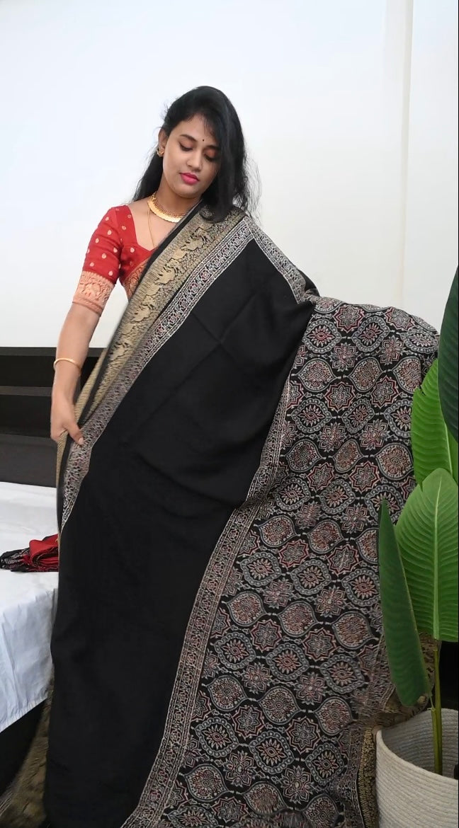 Elevate your ethnic wardrobe with this exquisite Dola silk saree, adorned with traditional Ajrakh hand block prints crafted by skilled artisans. Made using age-old techniques and dyed naturally without chemicals, this saree is a beautiful blend of heritage, sustainability, and elegance.