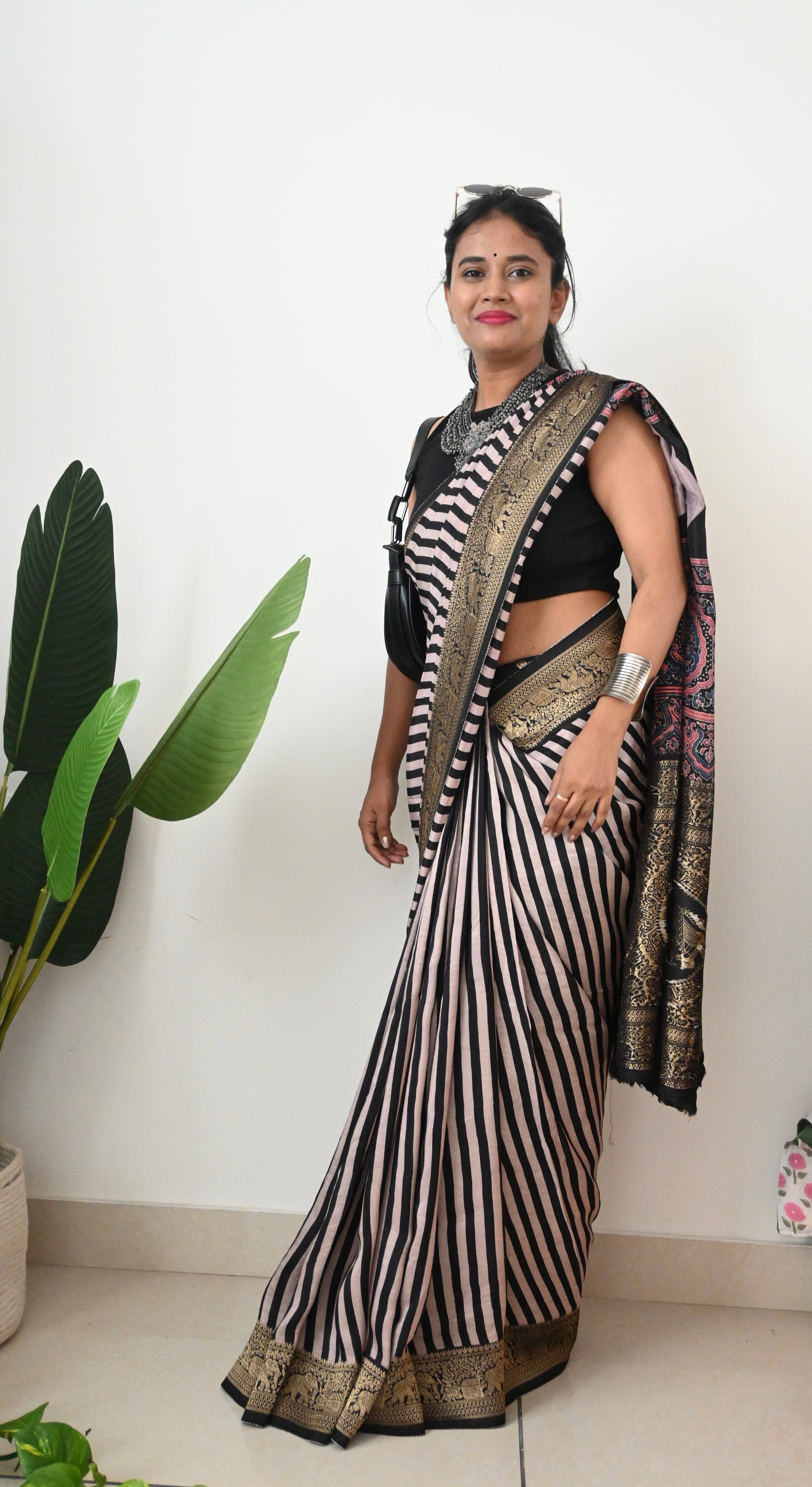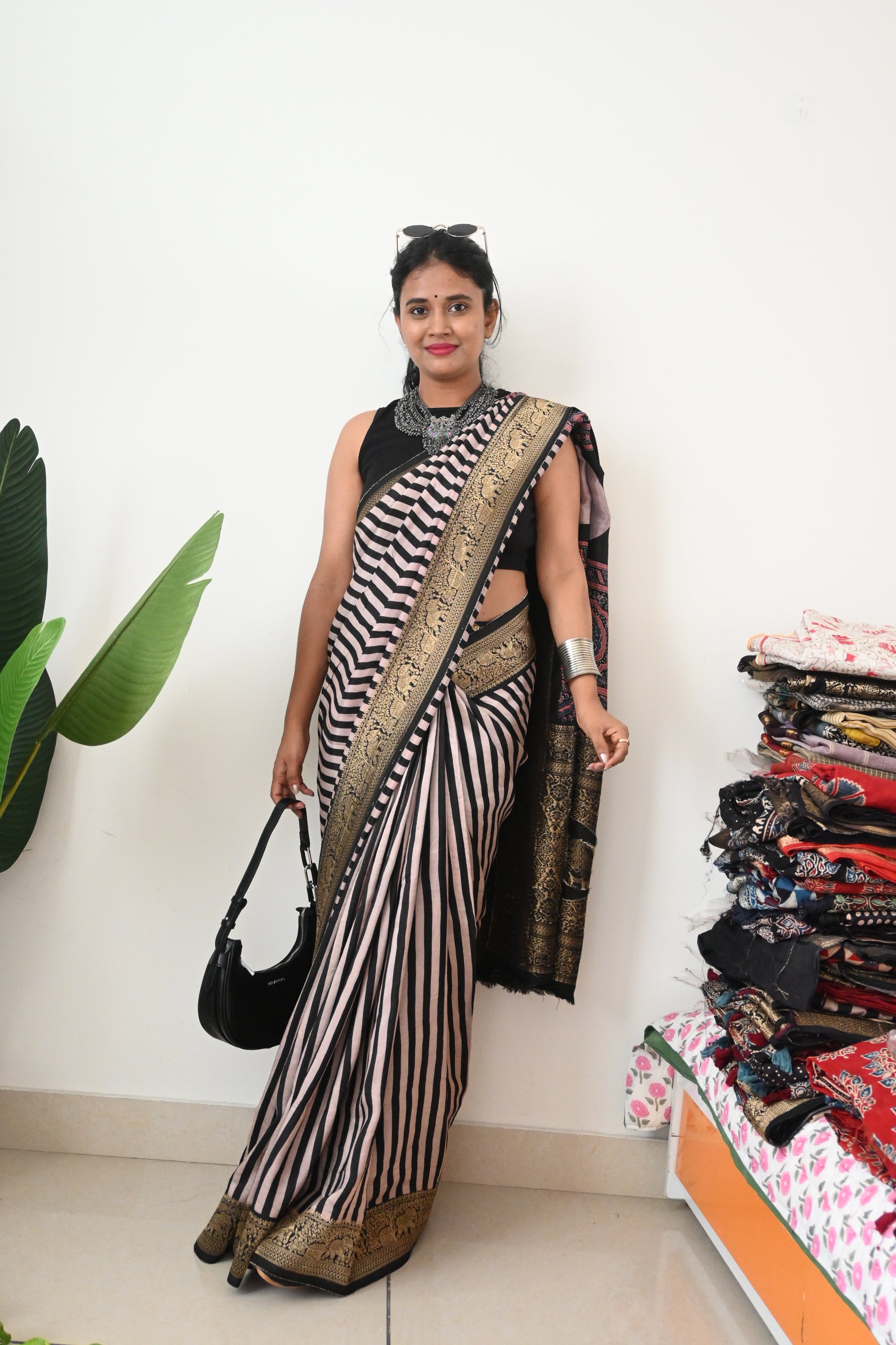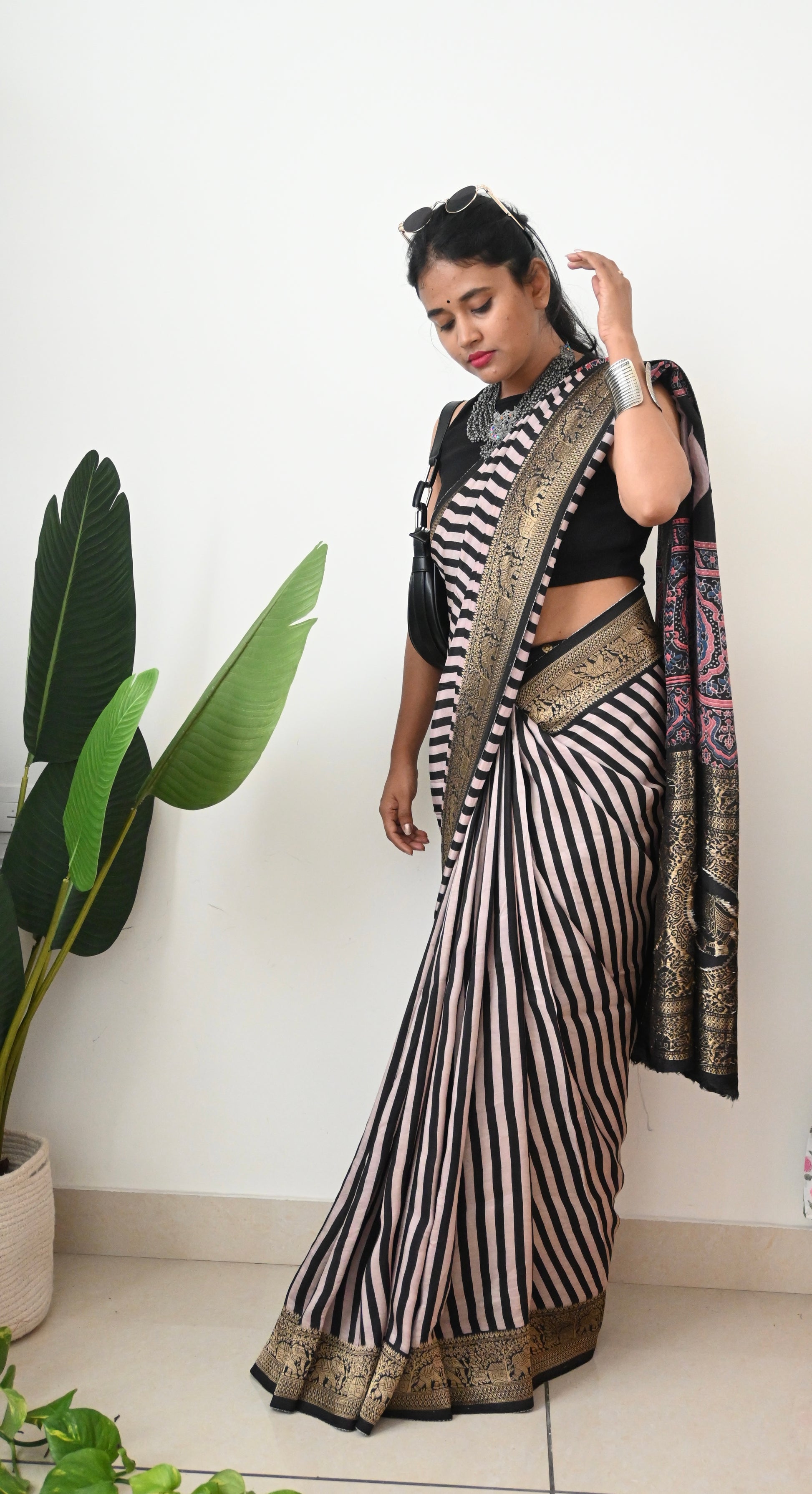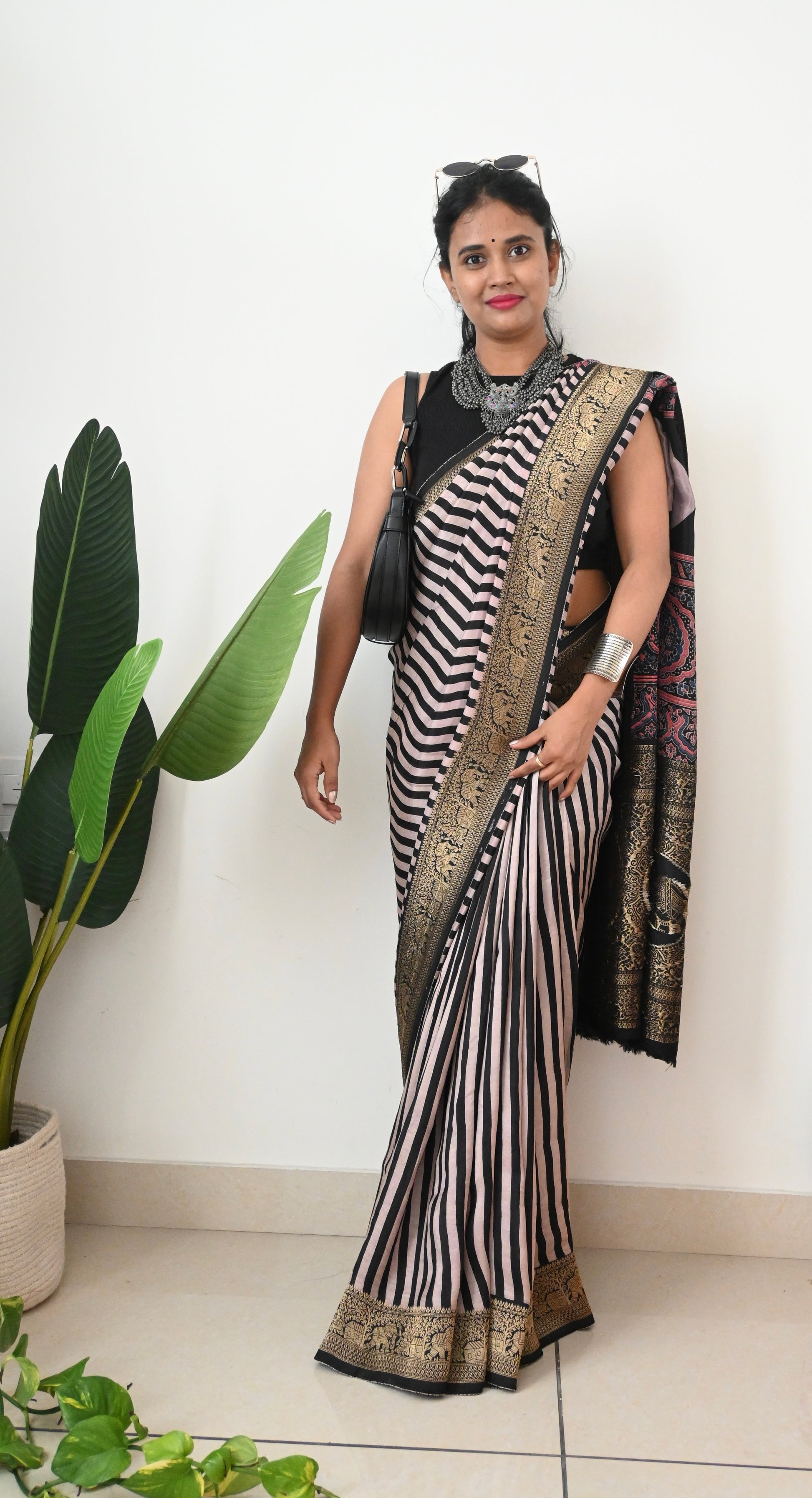 Elevate your ethnic wardrobe with this exquisite Dola silk saree, adorned with traditional Ajrakh hand block prints crafted by skilled artisans. Made using age-old techniques and dyed naturally without chemicals, this saree is a beautiful blend of heritage, sustainability, and elegance.