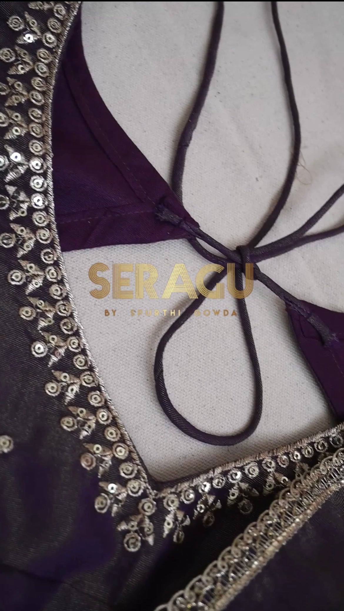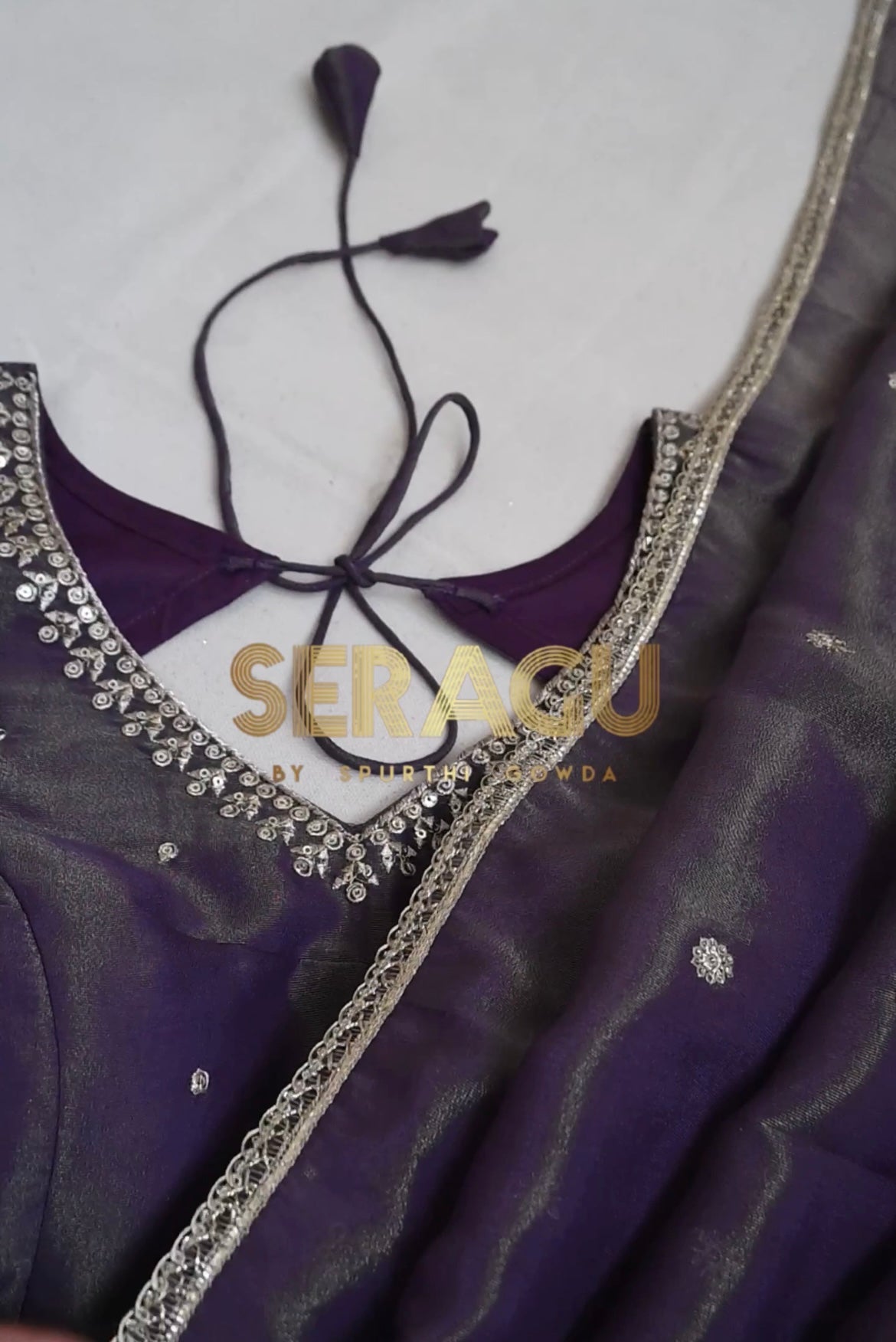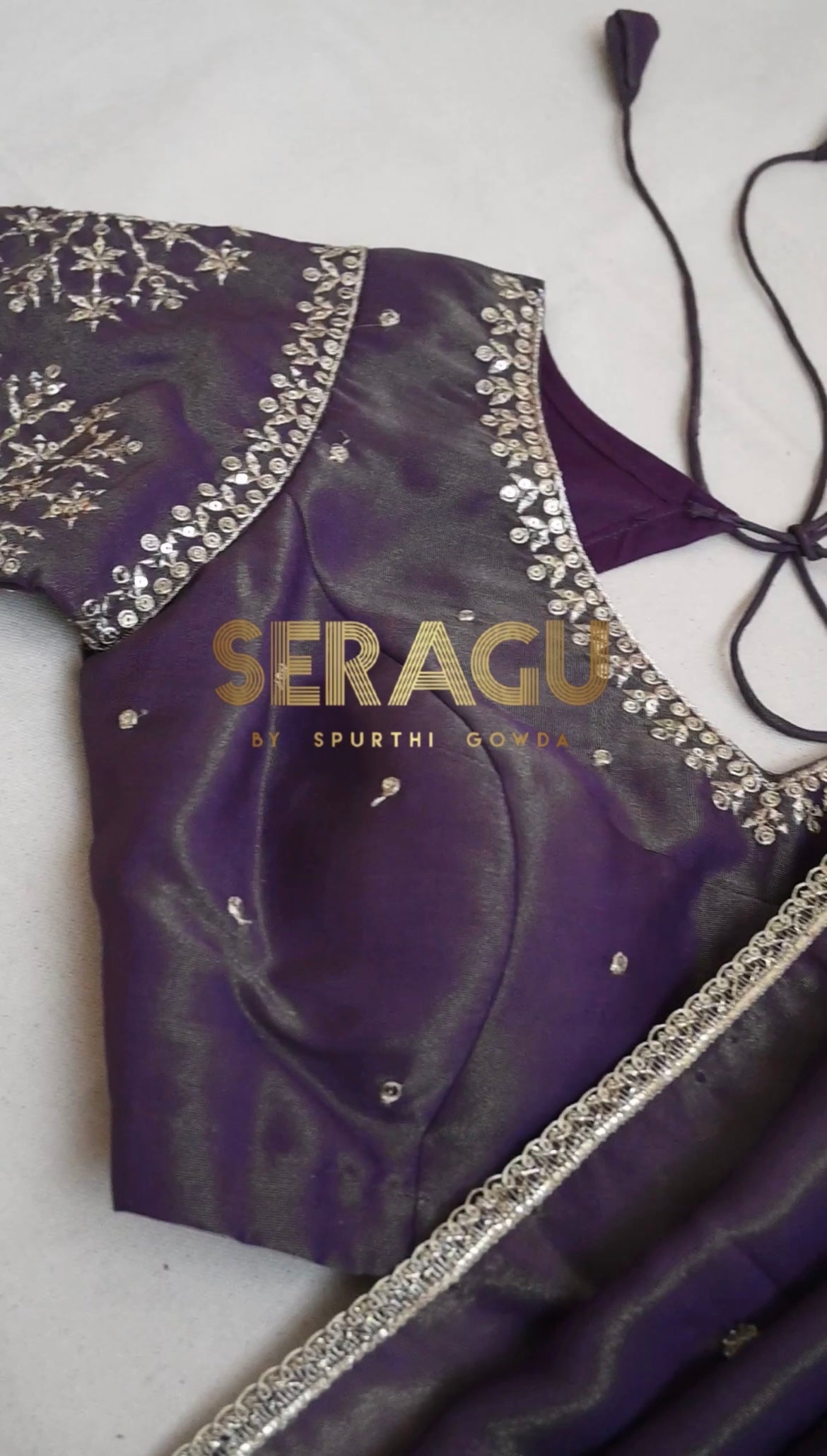Radiate elegance in our Cosmos Tissue Zari Shine Saree, featuring a very soft crash finish with delicate sequin butti work and luxurious Sabyasachi-style lace. The fabric shimmers with golden hues that beautifully shift under light and sunlight, adding a magical glow to every step. Paired with a fully stitched sequin embroidered blouse for the perfect festive or wedding look.