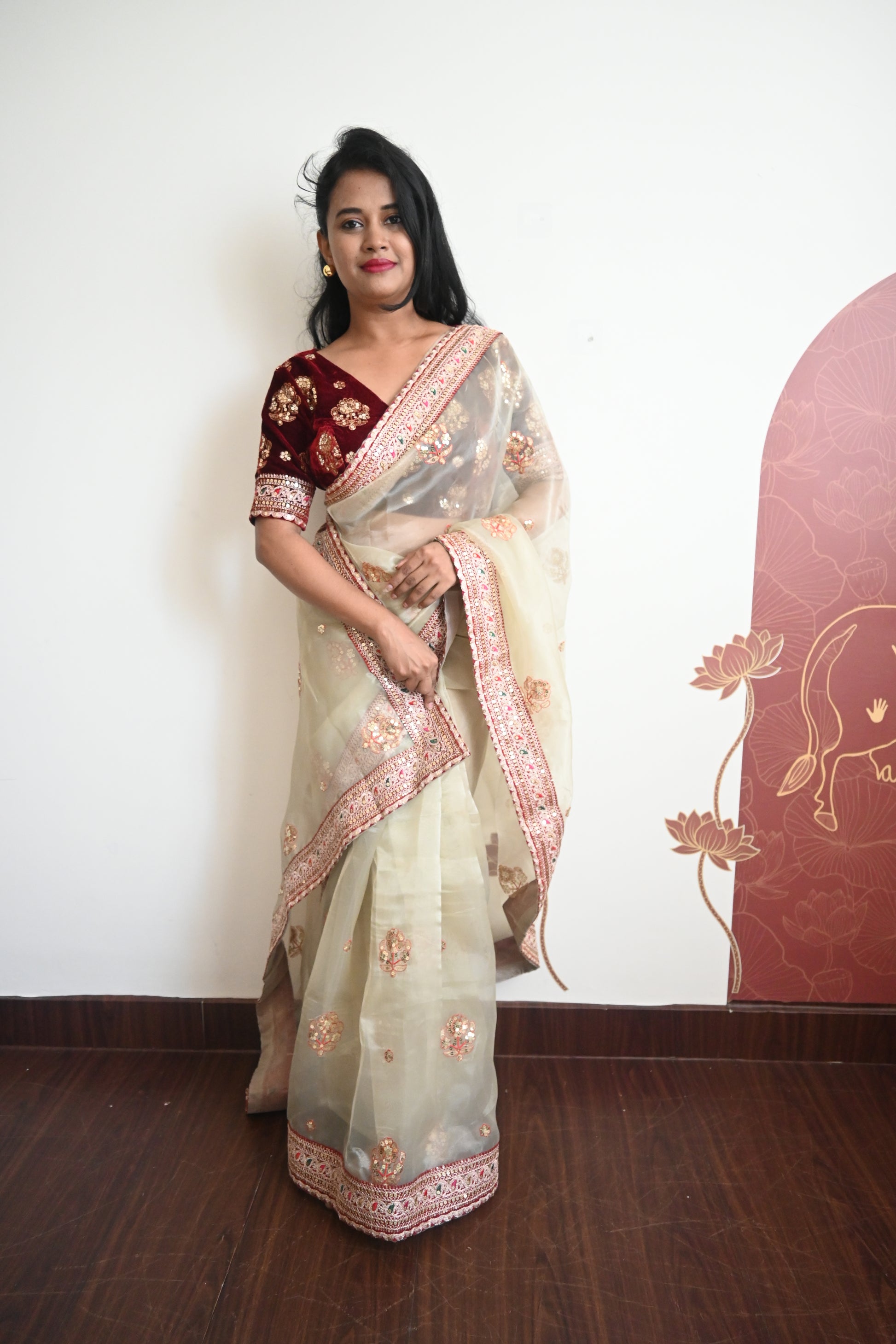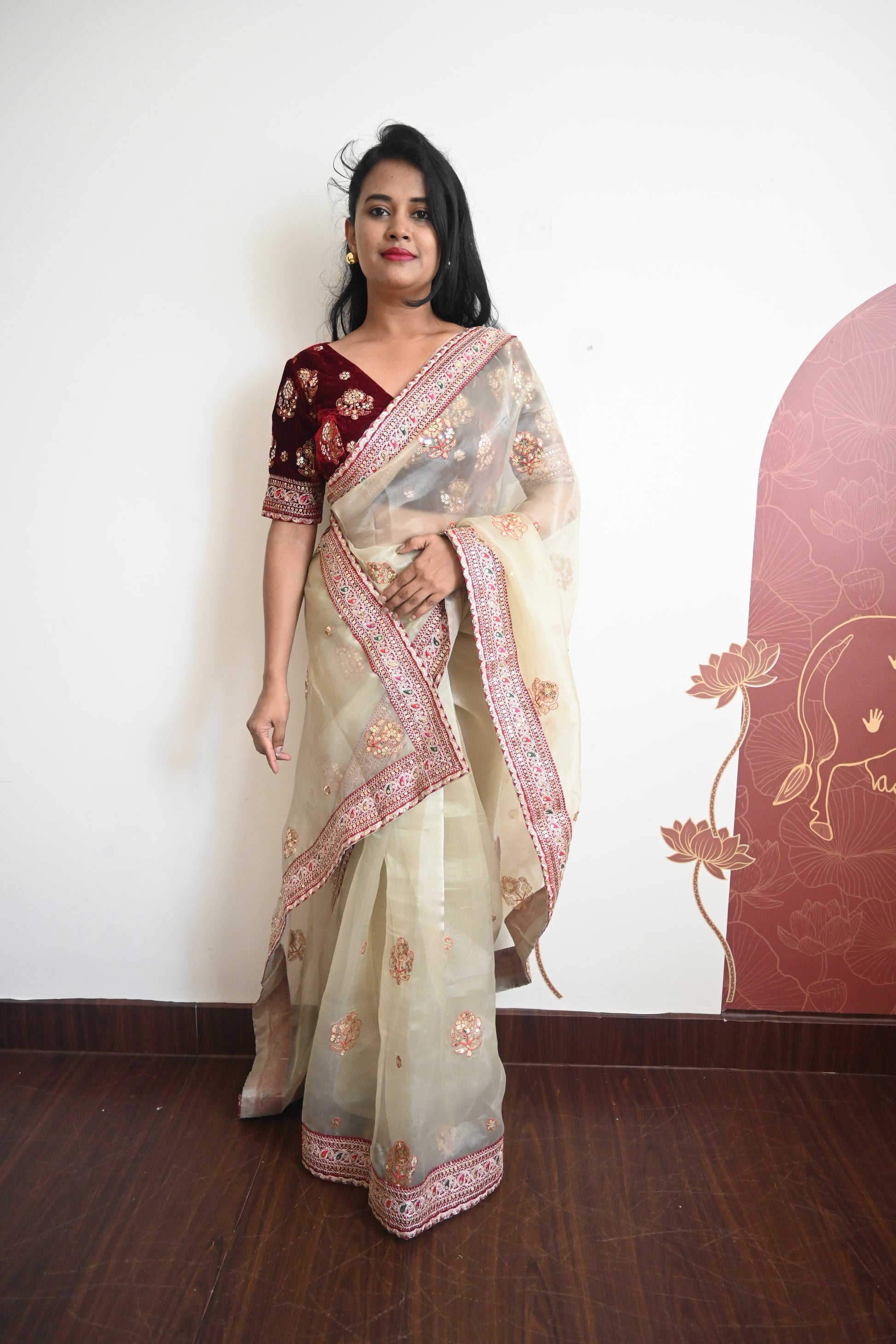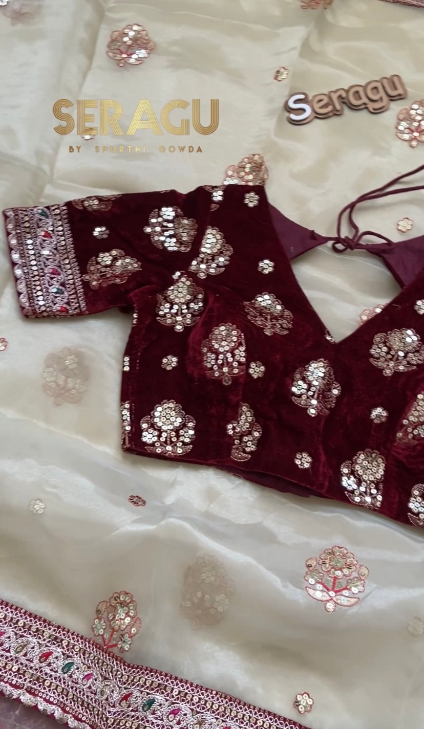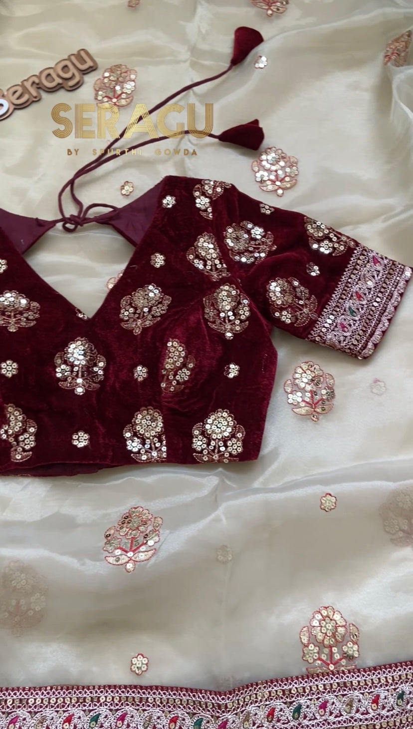 Grace in every thread Organza elegance adorned with delicate embroidered Buttas and a stunning coding work border. Paired with a full-work velvet blouse for that regal touch.