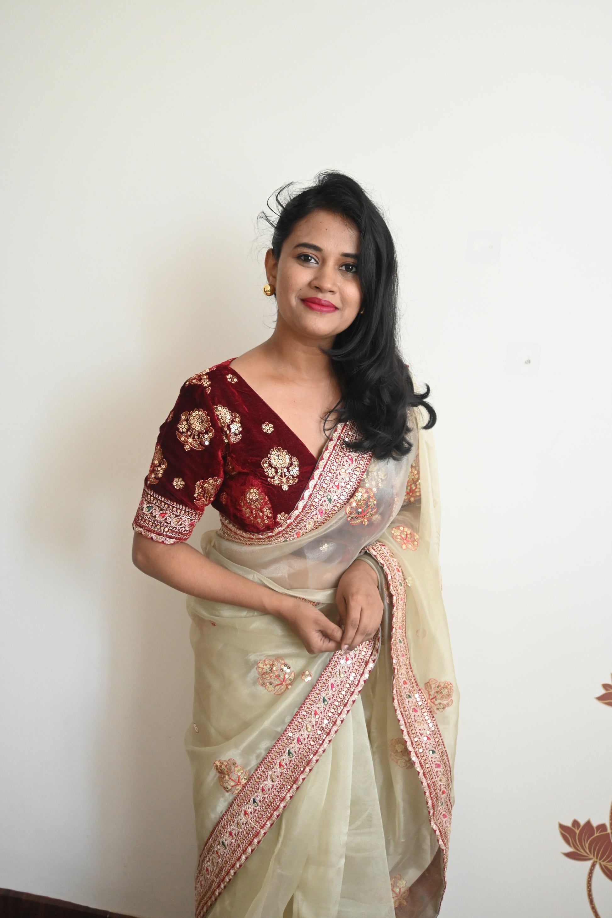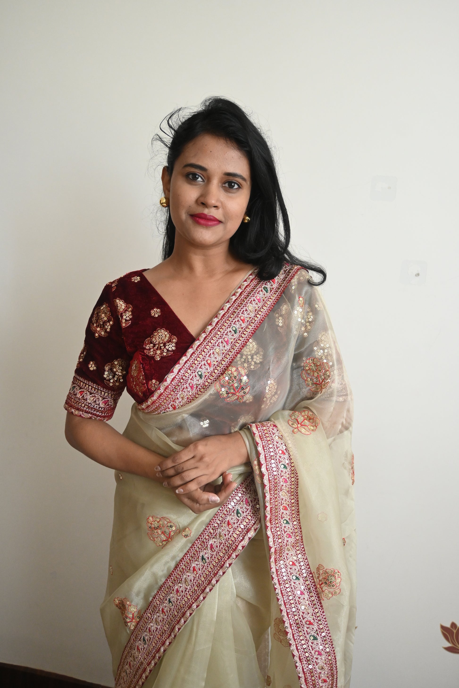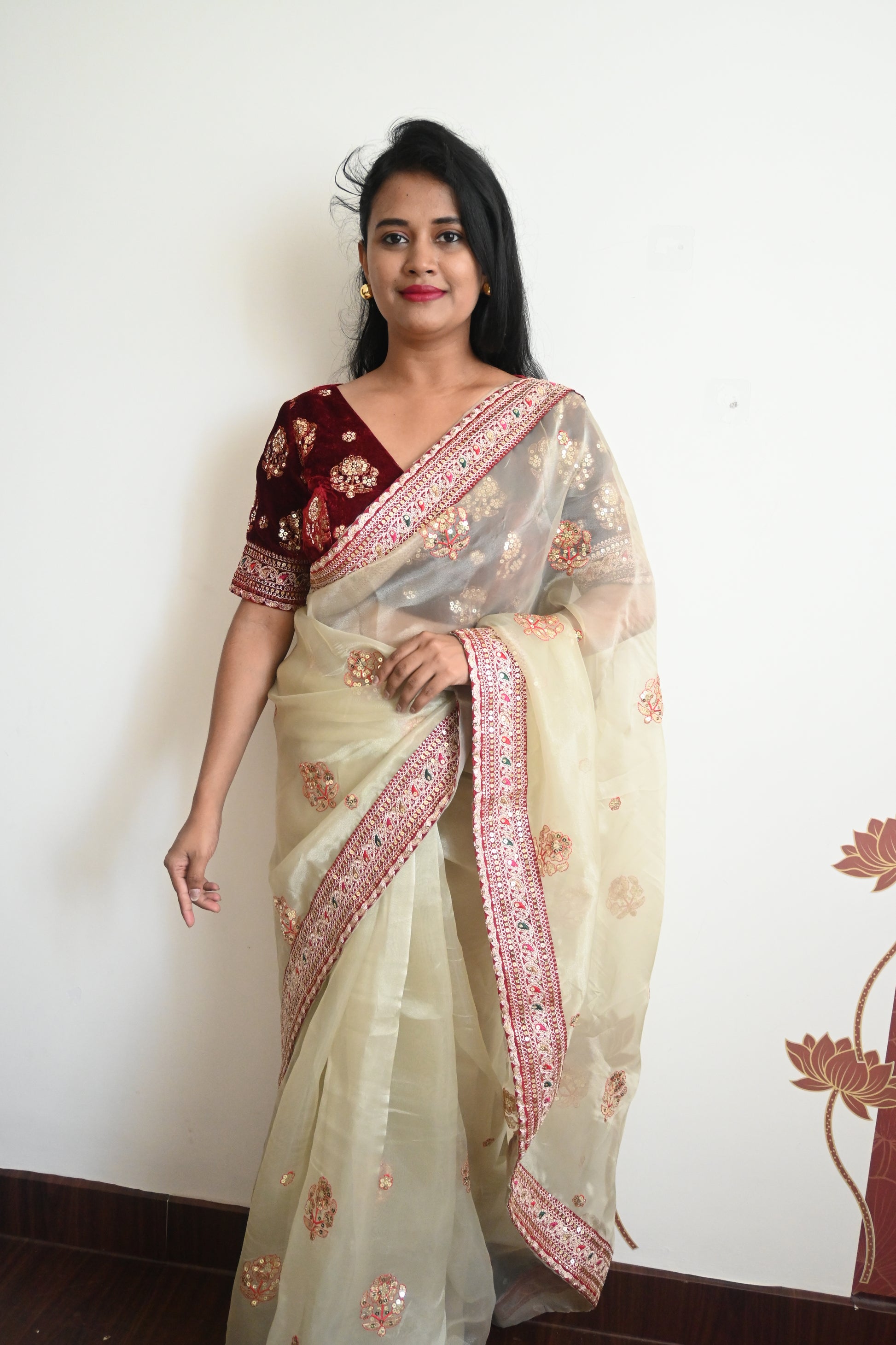 Grace in every thread Organza elegance adorned with delicate embroidered Buttas and a stunning coding work border. Paired with a full-work velvet blouse for that regal touch.