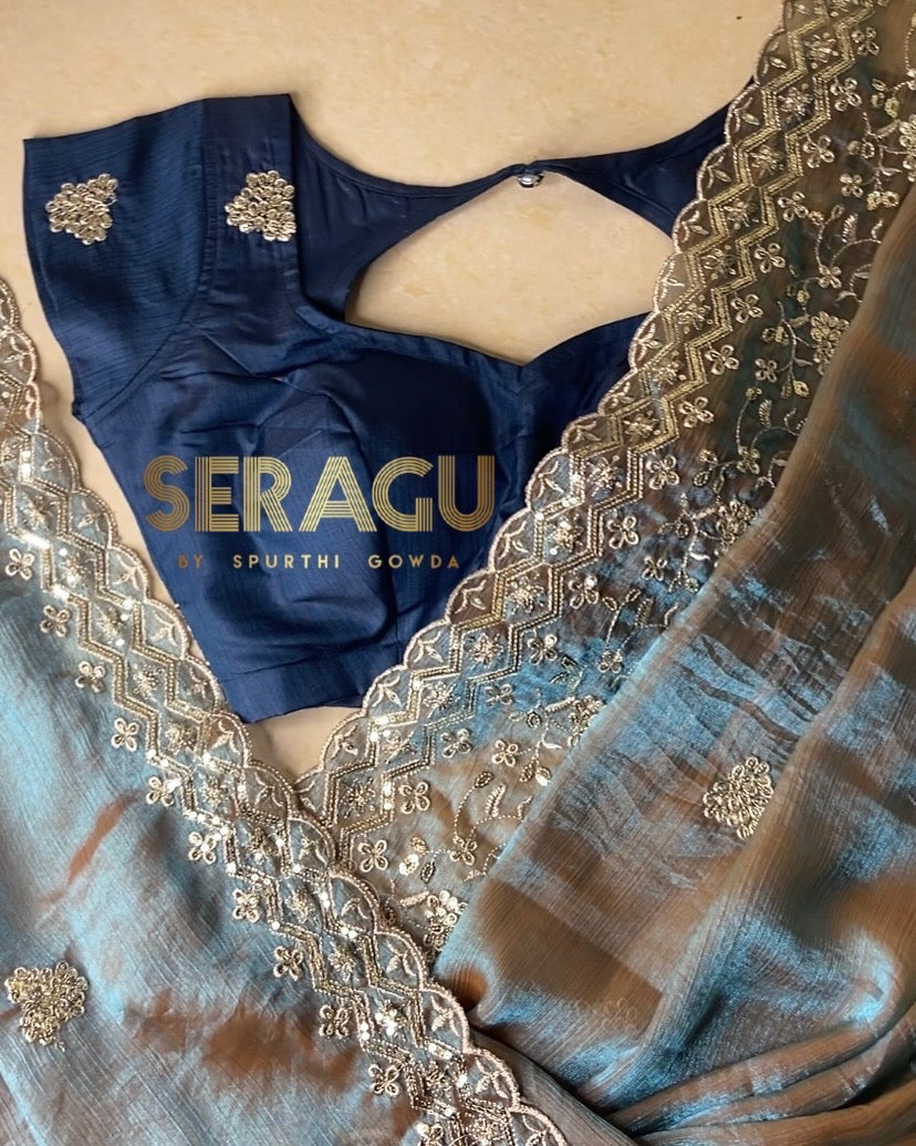 Grace and allure intertwine in this dual-toned masterpiece. The saree showcases detailed, structured embroidery that highlights its sophistication, while the blouse adorned with delicate lace adds a touch of timeless charm.