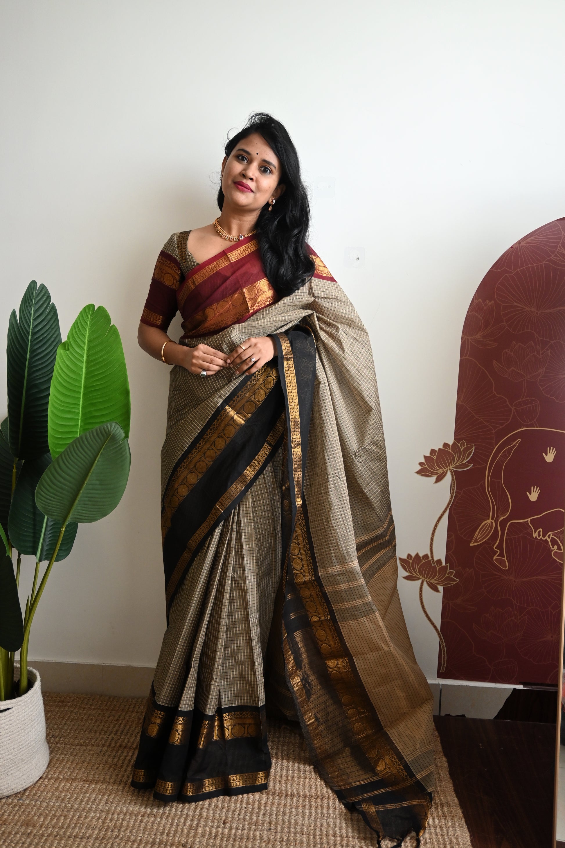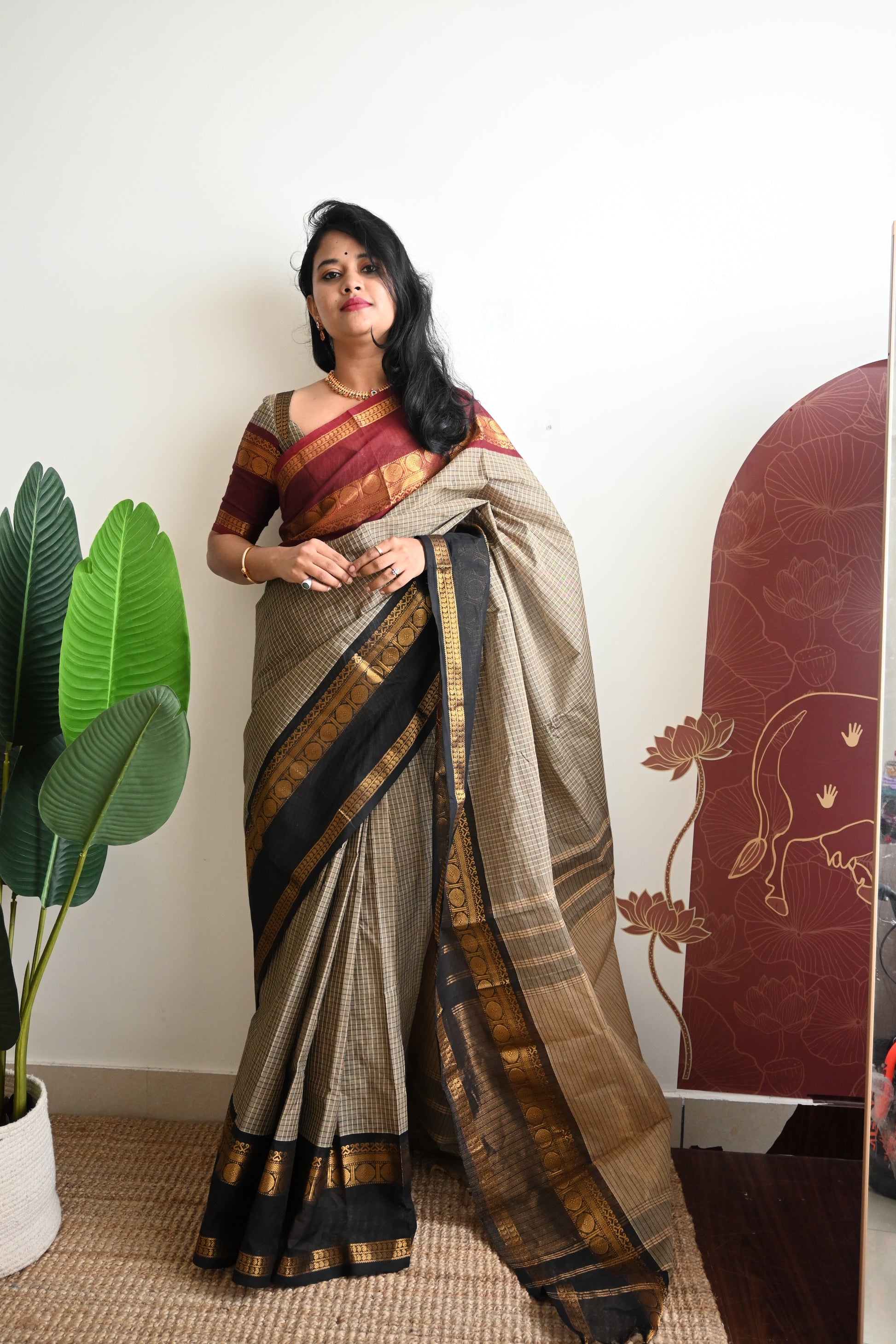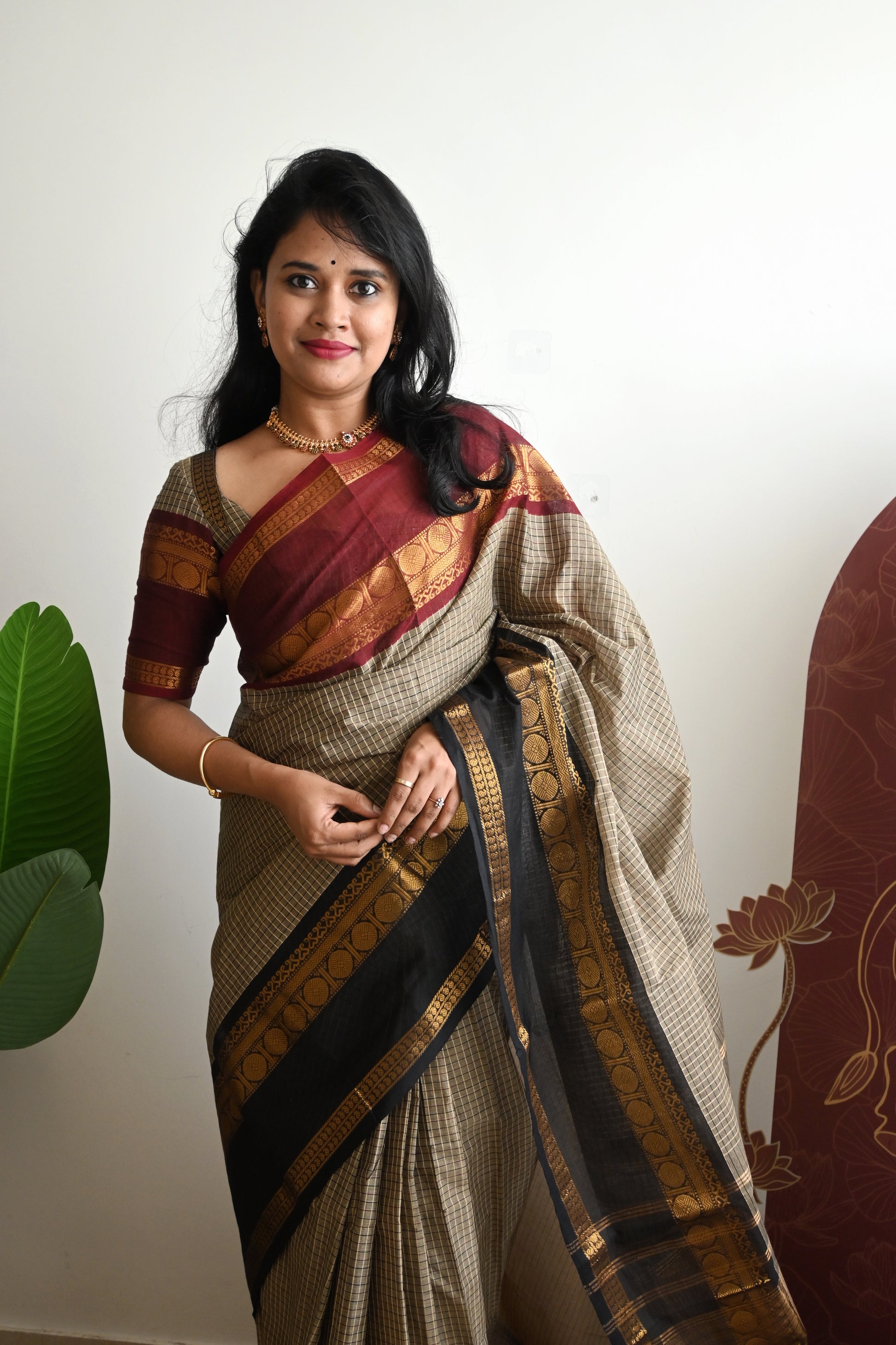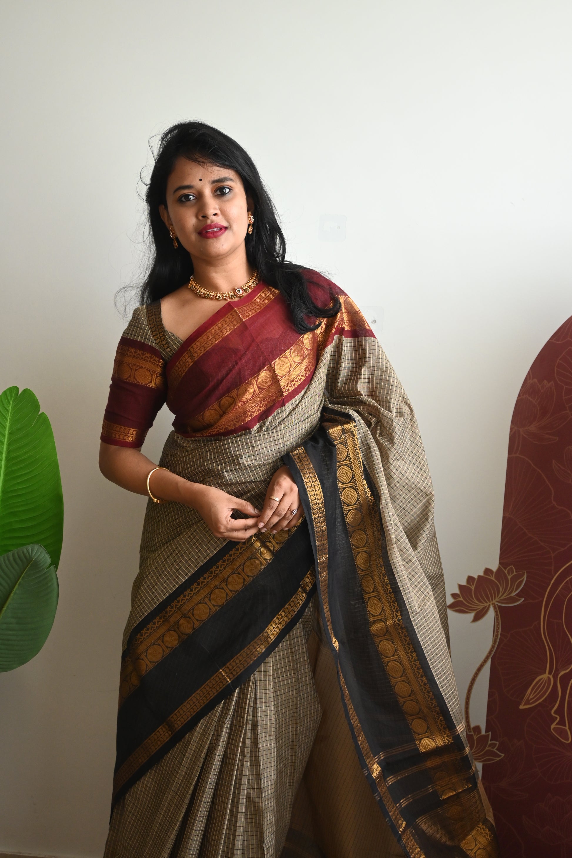 Kanchi Cotton Zari Boarder, Korvai checks Body and With zari line Pallu.