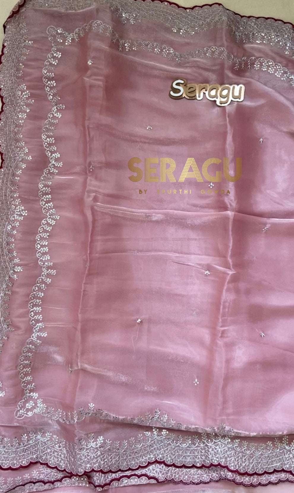 Features coded embroidery with delicate scallop work. This saree comes with a stitched blouse