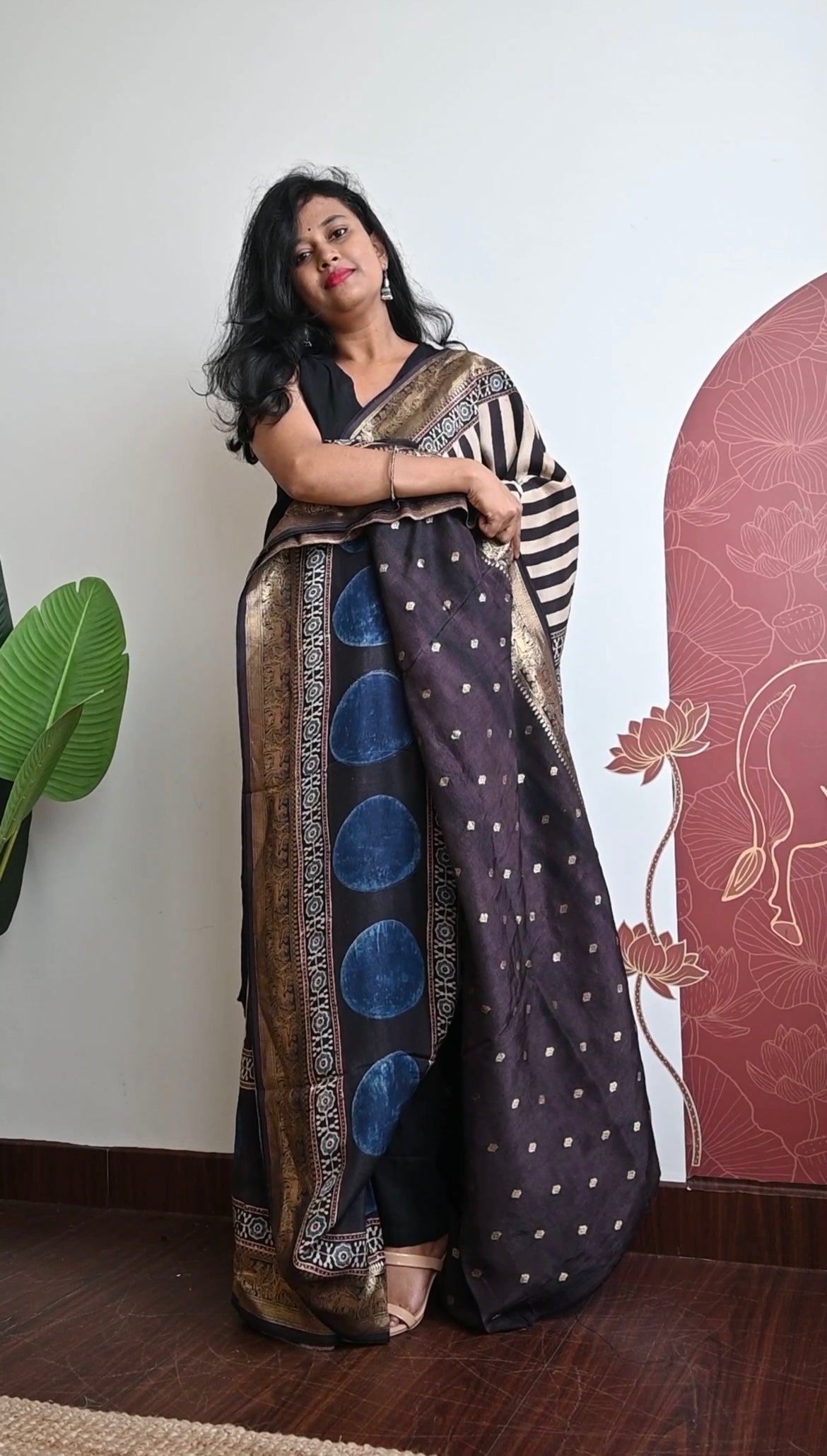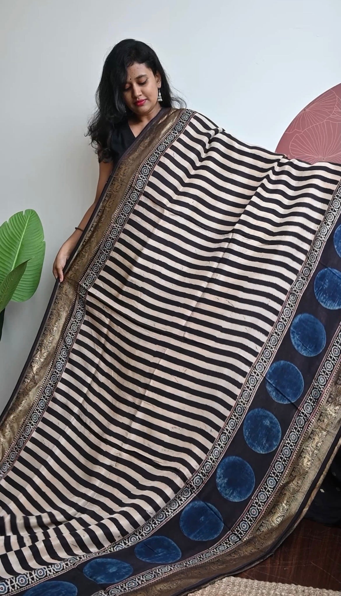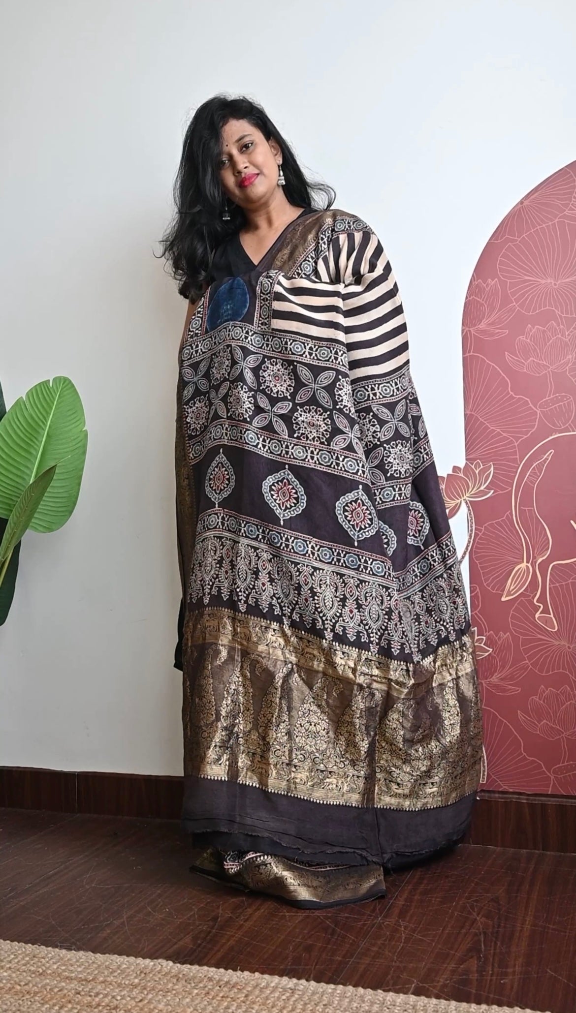 Elevate your ethnic wardrobe with this exquisite Dola silk saree, adorned with traditional Ajrakh hand block prints crafted by skilled artisans. Made using age-old techniques and dyed naturally without chemicals, this saree is a beautiful blend of heritage, sustainability, and elegance.