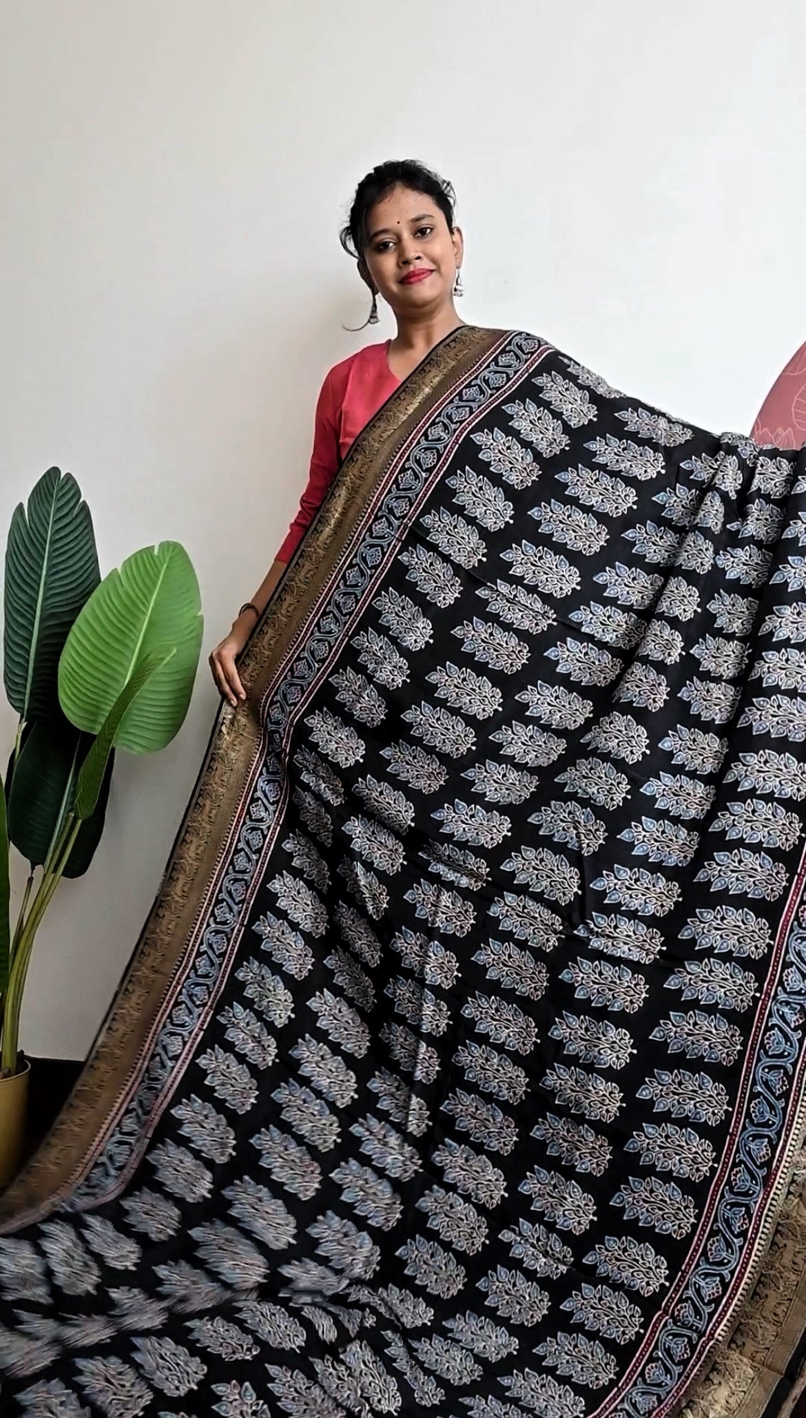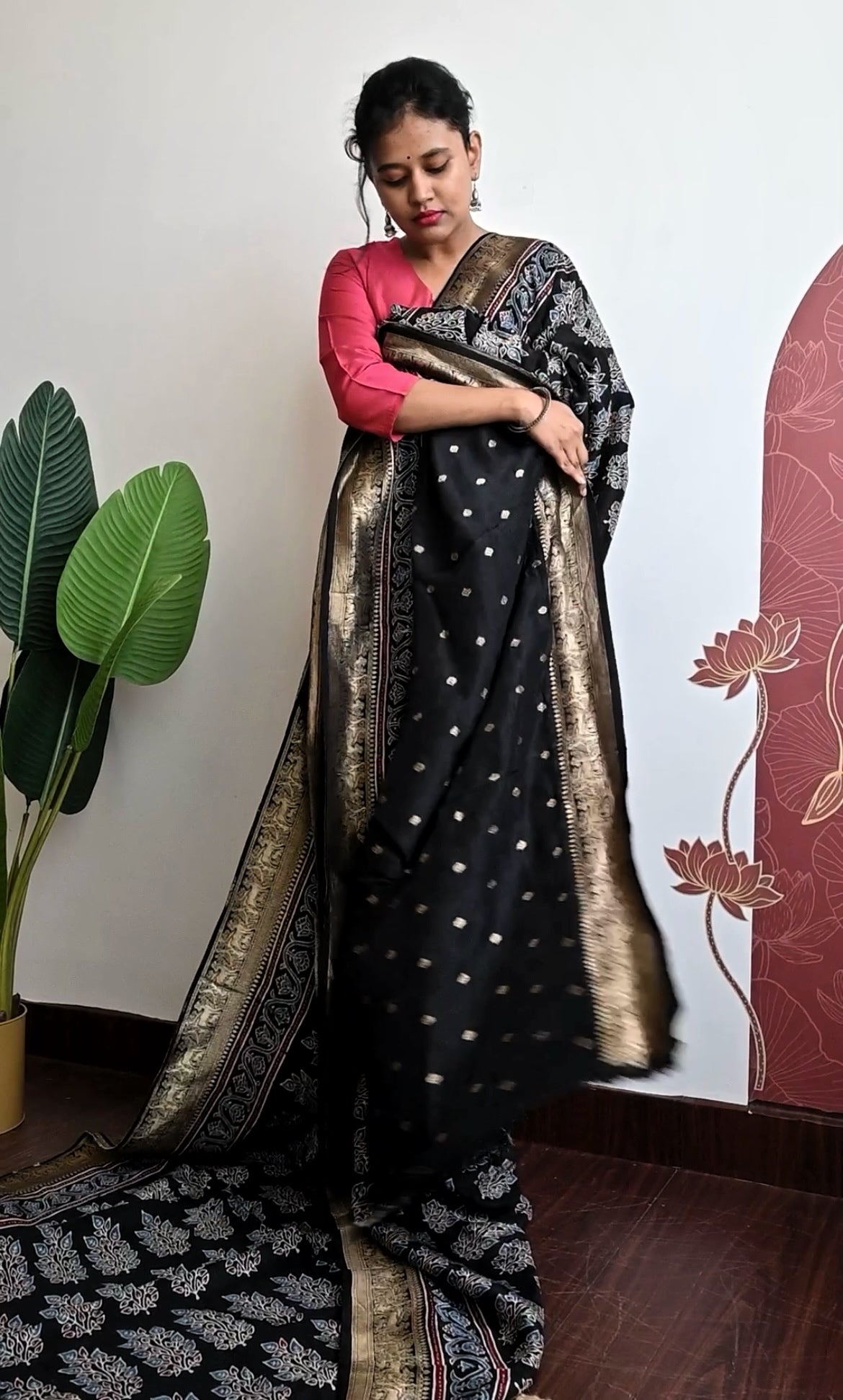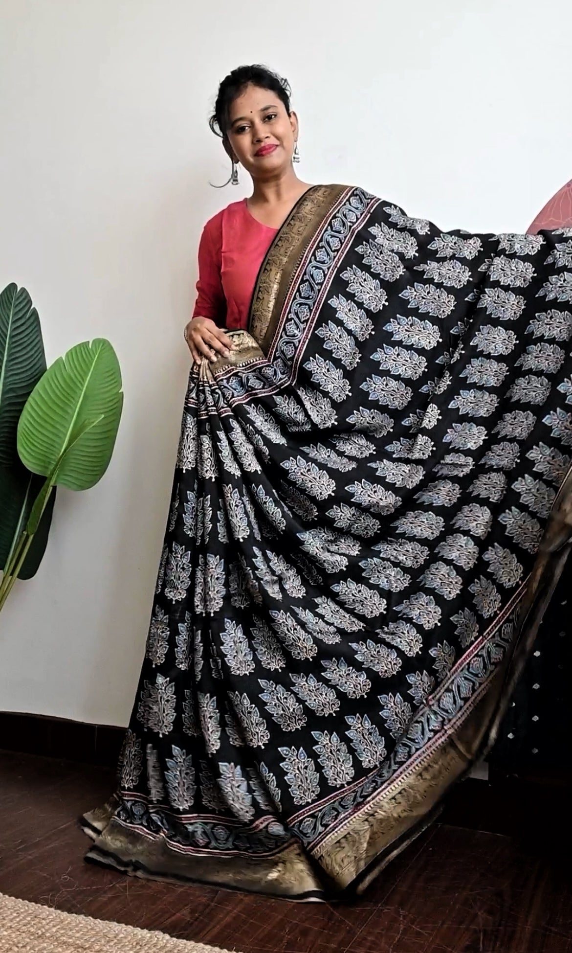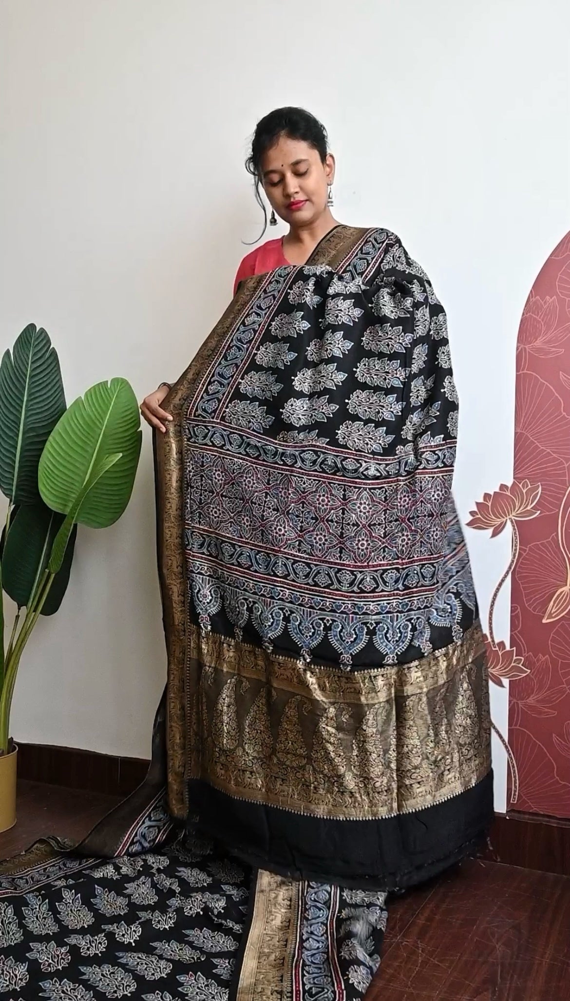 Elevate your ethnic wardrobe with this exquisite Dola silk saree, adorned with traditional Ajrakh hand block prints crafted by skilled artisans. Made using age-old techniques and dyed naturally without chemicals, this saree is a beautiful blend of heritage, sustainability, and elegance.